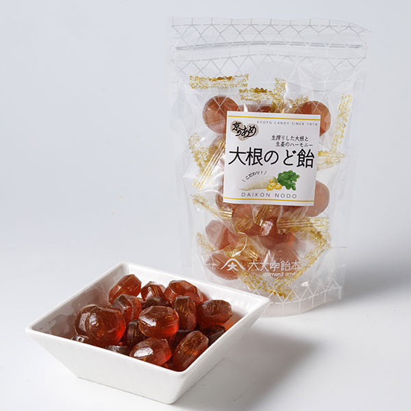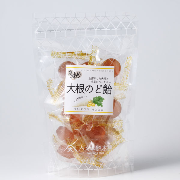 口に入れていただくと、大根と生姜の風味が飴とマッチして深い味わいを醸し出します。 大文字飴の製法を活かしたのど飴です。