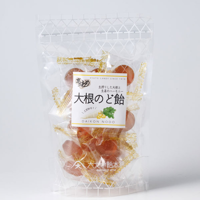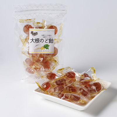 京野菜の聖護院大根と、国内産の生姜を使い、素材の味を大切に焚き上げた、のど飴。素材本来の味を活かして作り上げた、当店が得意とする製法の、のど飴です。のど飴に是非お試しください。
