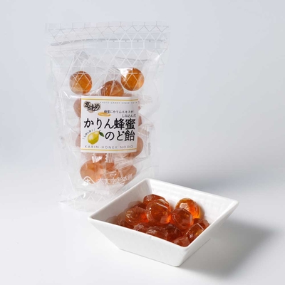 かりんの実をはちみつ漬けにして、しっかり漬け込んでいます。砂糖と水飴をじっくり焚き上げた飴に、カリン蜂蜜漬けを加えて作りのど飴です。はちみつのまろやかさがやさしい舐め口に繋がっています。のど飴として人気の商品です。